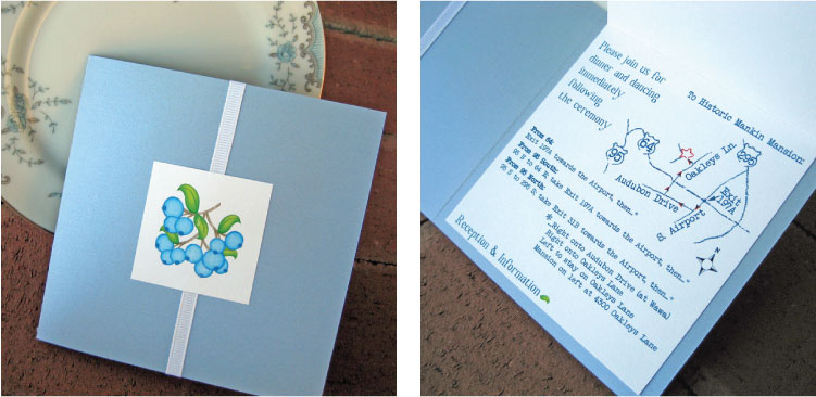 When Katie and Chad brought their inspiration of using blueberries throughout their custom wedding invitation and paper goods to Dogwood Blossom Stationery, I was excited to get started.  They choose a pearl-like opal blue paper for the invitation, paired with white cardstock and white grosgrain ribbon.  To make things easy on guests, they asked for a custom map to the weekend venue driving from each direction.  In order to accommodate the map, we created a square, folding wedding invitation that opened on the right to reveal the invitation itself and then flipped up to reveal the map and directions.  In the end, three different blueberry motifs were designed to adorn the various handmade paper pieces: wedding invitation, response enclosure, seating cards, and table numbers.