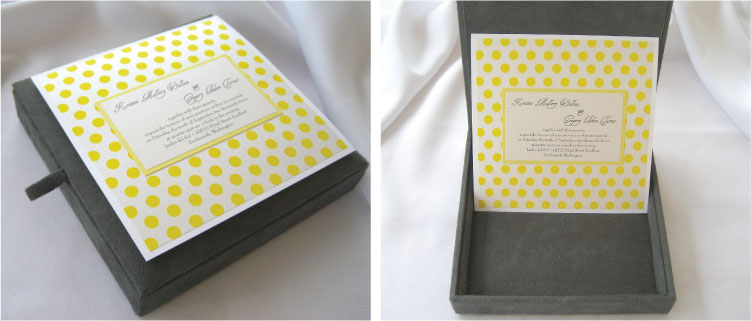 The gray and yellow wedding invitation in the photos above is layered with textured whites and pearlized whites, and printed with polka dots in bright sunshine yellow. It is placed in a square microsuede invitation box in stone gray. This wedding invitation is mailed using a white outer mailer and custom mailing labels to coordinate with the invitation design that can be addressed by your hand or a professional calligrapher’s.