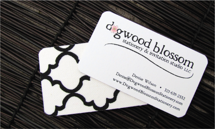 Several posts ago, I discussed the joys of using fabric on wedding invitations. I also told you at that time that I was super excited about my new business cards – which also use fabric – and that I would share them with you here someday. Well, the day has come!