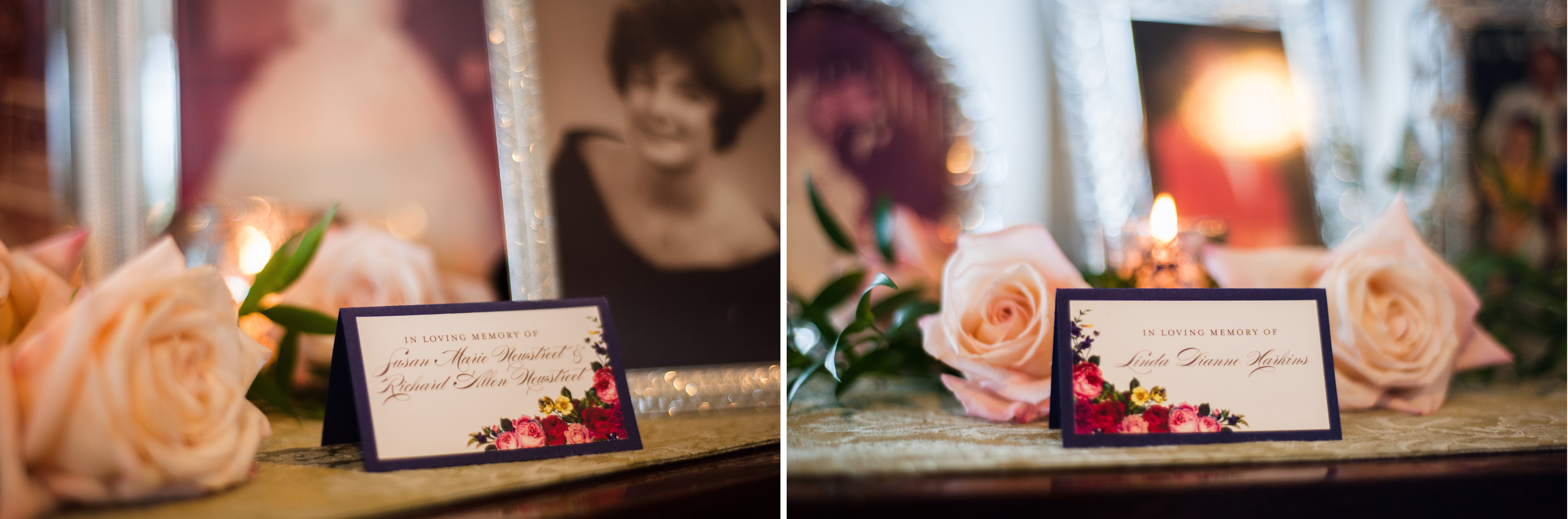The poppies, stripes and frames are carried throughout the paper goods. Featuring these motifs, the cheerful escort cards are mounted on folded navy tent cards. Displayed on the brilliant red chargers provided by BBJ Linens, our handcrafted menus also feature the charming monogram on the top header. A red fabric ribbon with notched ends is a perfect custom addition that gives a lovely textural effect, running vertically through the menu.