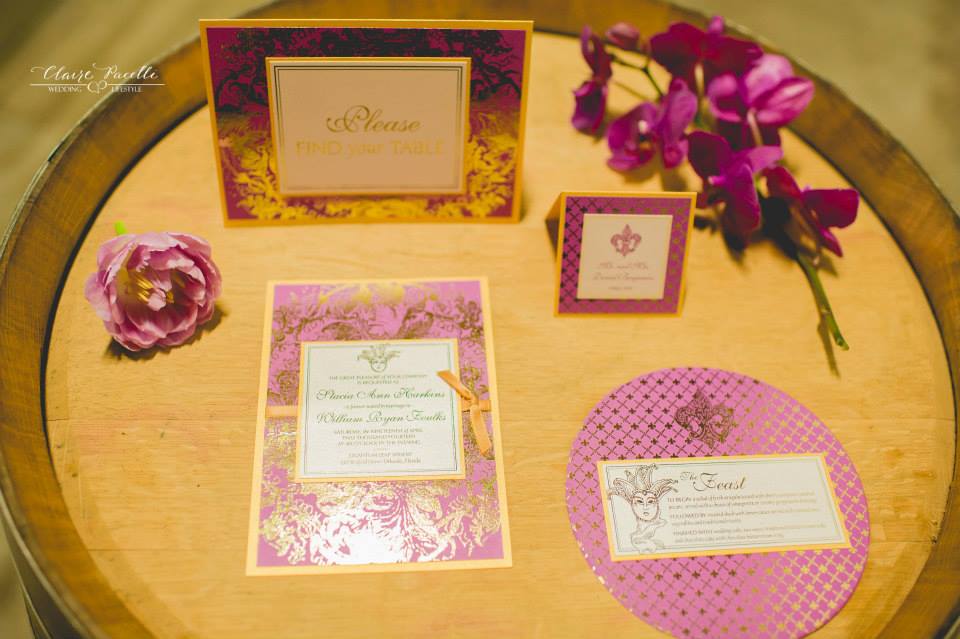 Our escort cards, table numbers, menus, and invitations are no exception to the glitz and glamour of the signature tune. Staying golden, the creamy background with simple line design stands out when put against the gilded surfaces. We used an Art Deco-inspired font that looks like they were created almost a century ago. The invitations were nestled in gold mesh pouches embellished with sequins and glass beads and placed in gold invitation boxes lined with white faux fur. Talk about decadence!
